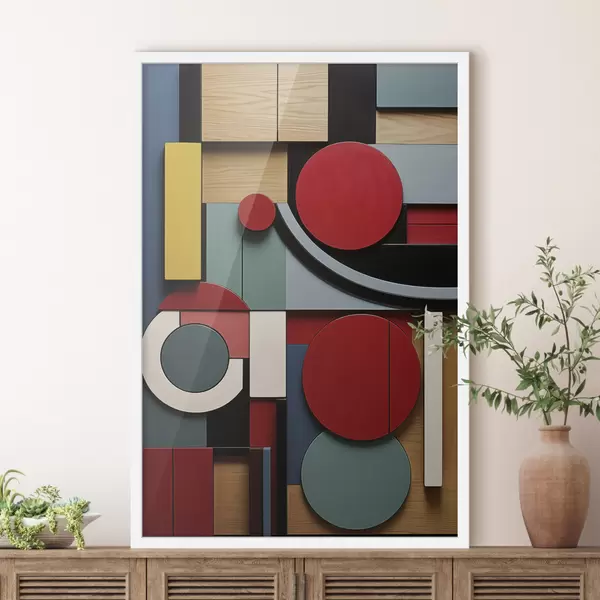Poster Absztrakt geometrikus kompozíció fa textúra utánzattal, piros, fekete, fehér és türkizkék téglalapokkal és körökkel Nr f47876