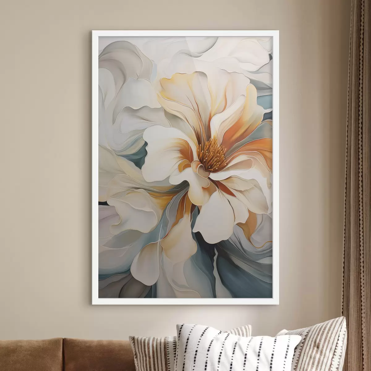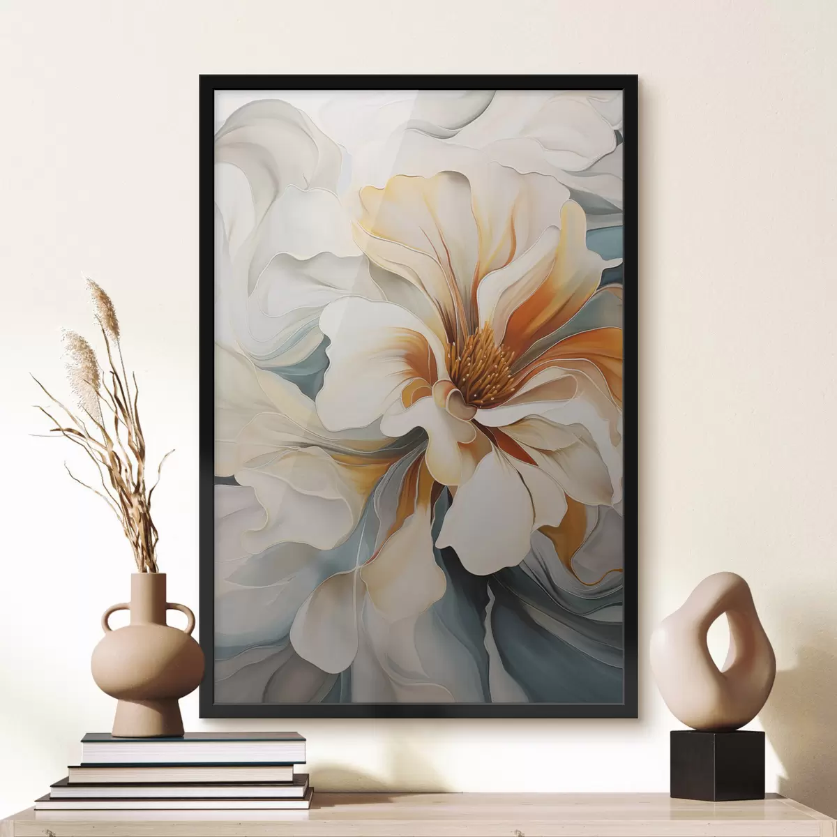 Poster Absztrakt nagy virág fehér, narancssárga és türkizkék szirmokkal, texturált háttérrel Nr f47877