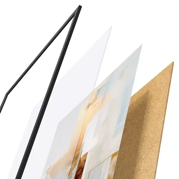 A poszter keretből, plexiből, nyomtatott képből és forgácslap hátlapból áll. A poszter a hátoldalon található rögzítőknek köszönhetően azonnal felakasztható a falra.