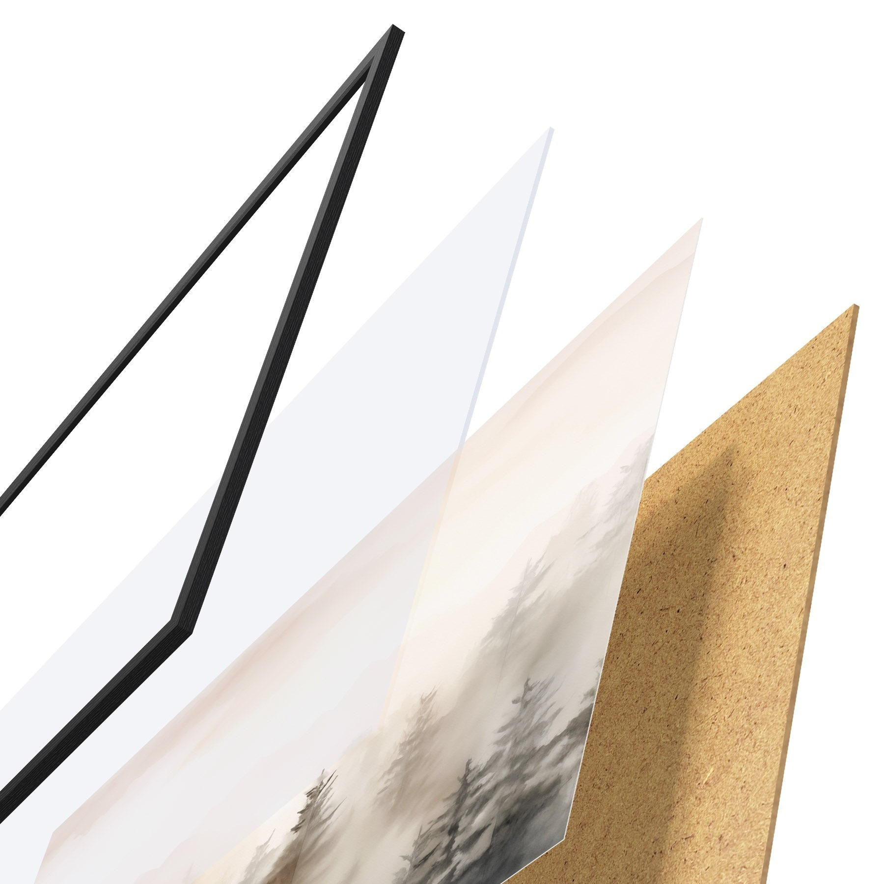 A poszter keretből, plexiből, nyomtatott képből és forgácslap hátlapból áll. A poszter a hátoldalon található rögzítőknek köszönhetően azonnal felakasztható a falra.