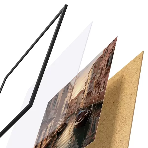 A poszter keretből, plexiből, nyomtatott képből és forgácslap hátlapból áll. A poszter a hátoldalon található rögzítőknek köszönhetően azonnal felakasztható a falra.