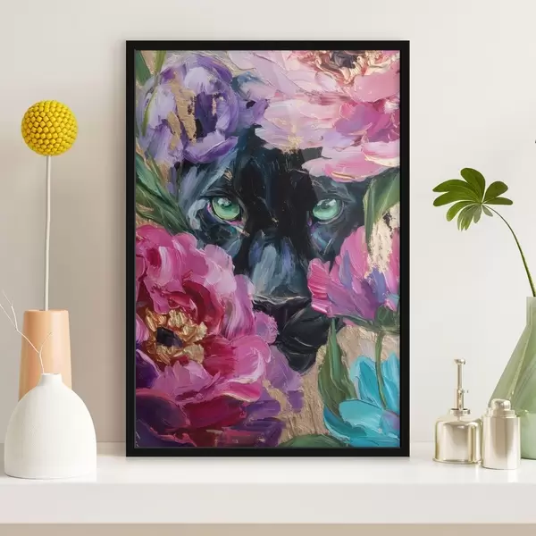 Poster egy fekete párduc kandikál ki a pünkösdi rózsák közül Nr f47936