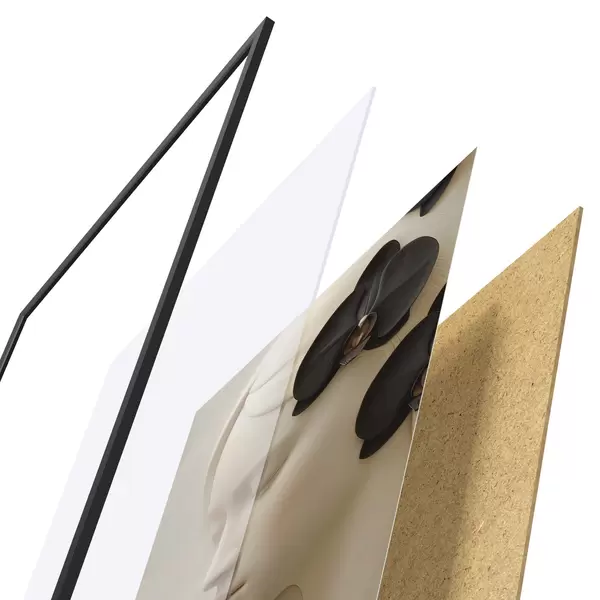 A poszter keretből, plexiből, nyomtatott képből és forgácslap hátlapból áll. A poszter a hátoldalon található rögzítőknek köszönhetően azonnal felakasztható a falra.