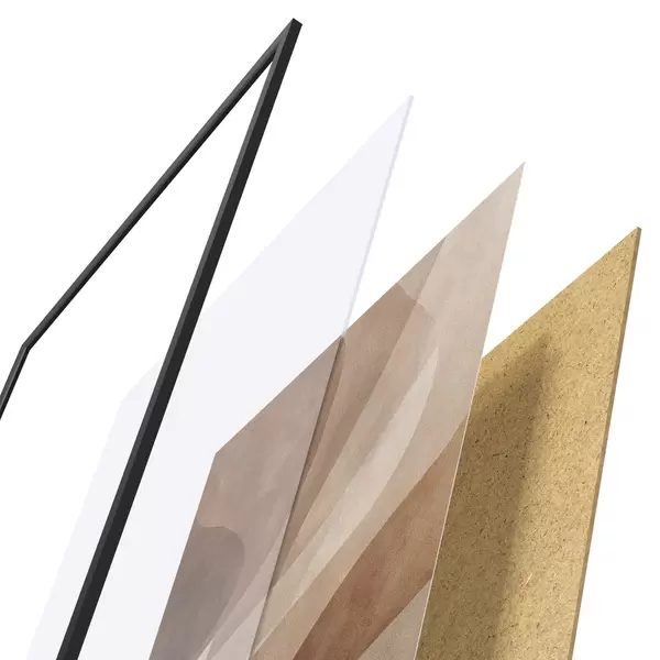 A poszter keretből, plexiből, nyomtatott képből és forgácslap hátlapból áll. A poszter a hátoldalon található rögzítőknek köszönhetően azonnal felakasztható a falra.