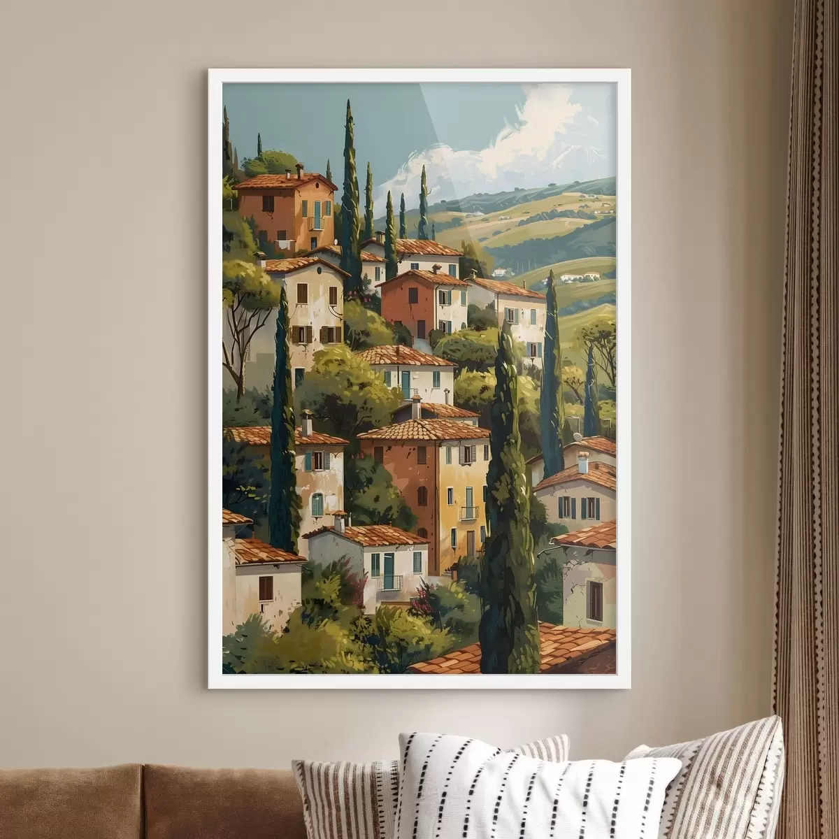 Poster mediterrán domboldali falu, egymásra épült, meleg tónusú házak terrakotta tetővel Nr f47950