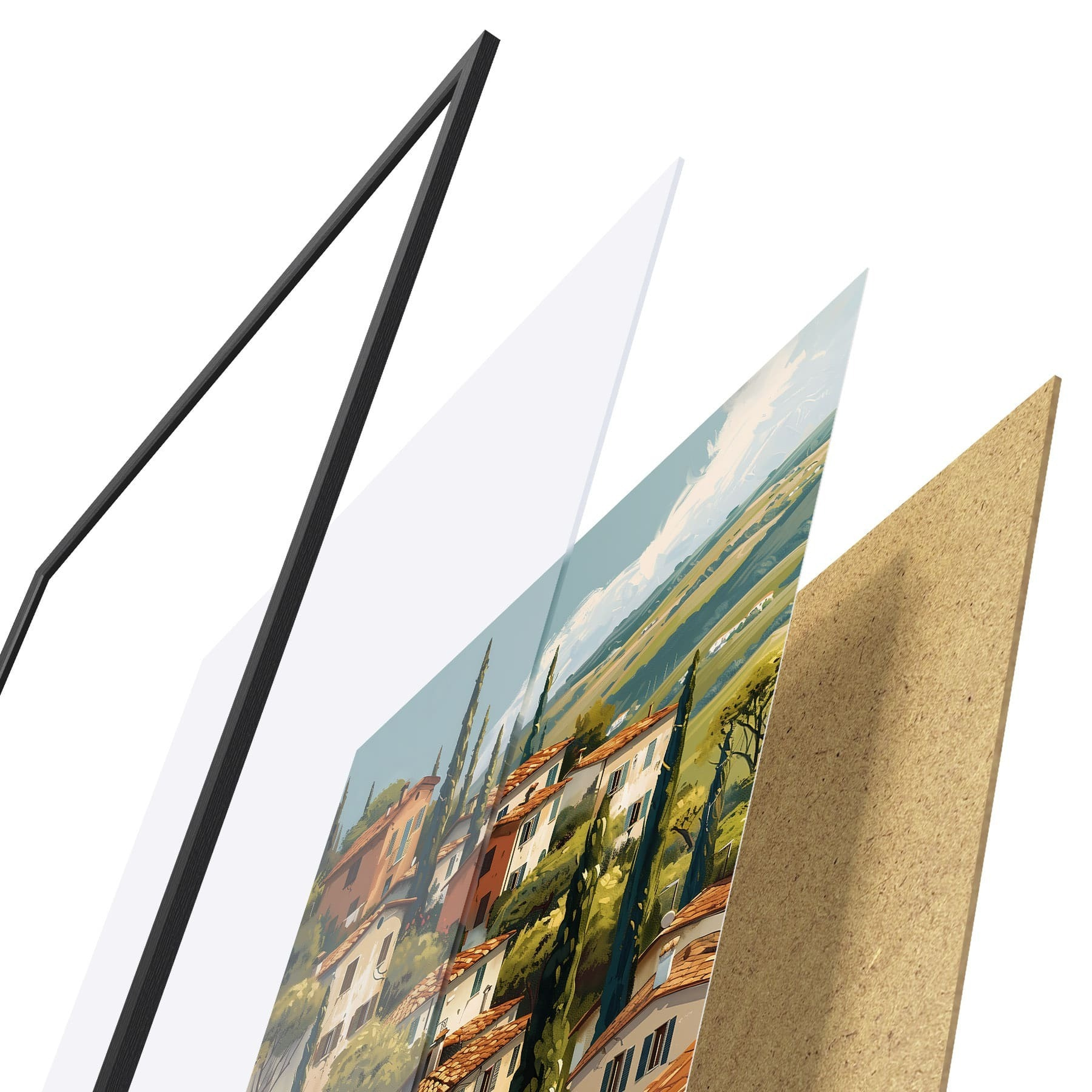 A poszter keretből, plexiből, nyomtatott képből és forgácslap hátlapból áll. A poszter a hátoldalon található rögzítőknek köszönhetően azonnal felakasztható a falra.