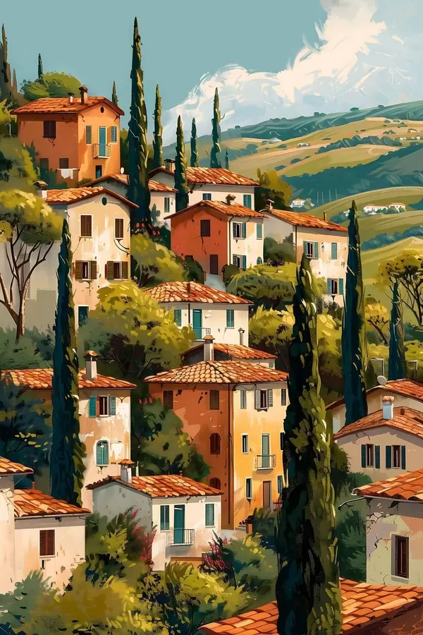 Poster mediterrán domboldali falu, egymásra épült, meleg tónusú házak terrakotta tetővel Nr f47950