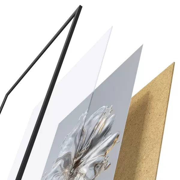 A poszter keretből, plexiből, nyomtatott képből és forgácslap hátlapból áll. A poszter a hátoldalon található rögzítőknek köszönhetően azonnal felakasztható a falra.