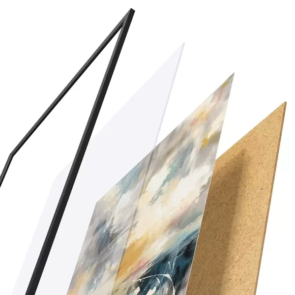A poszter keretből, plexiből, nyomtatott képből és forgácslap hátlapból áll. A poszter a hátoldalon található rögzítőknek köszönhetően azonnal felakasztható a falra.