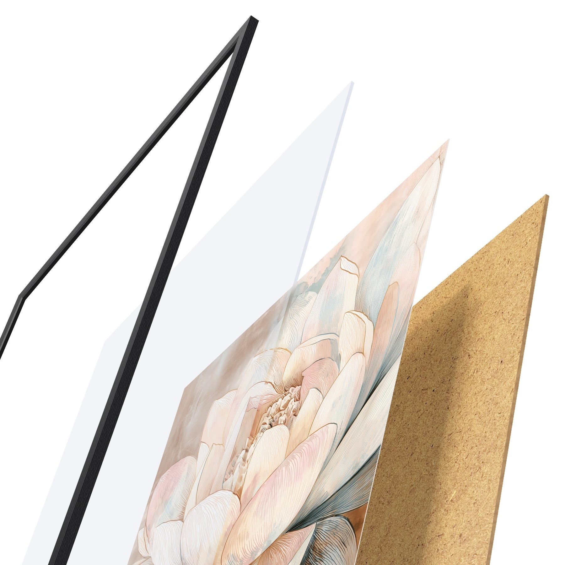 A poszter keretből, plexiből, nyomtatott képből és forgácslap hátlapból áll. A poszter a hátoldalon található rögzítőknek köszönhetően azonnal felakasztható a falra.