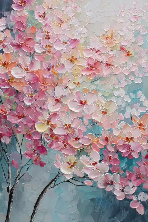 Poster Rózsaszín virágokkal díszített ág kék háttér előtt, olajfestmény stílusban Nr f47987