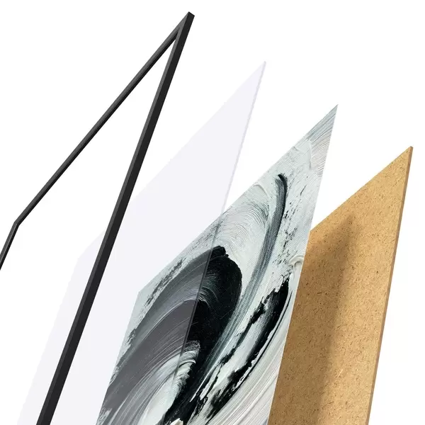 A poszter keretből, plexiből, nyomtatott képből és forgácslap hátlapból áll. A poszter a hátoldalon található rögzítőknek köszönhetően azonnal felakasztható a falra.