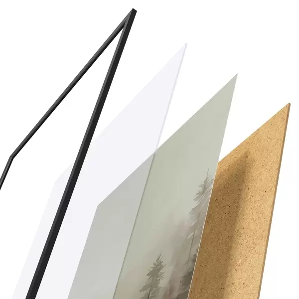 A poszter keretből, plexiből, nyomtatott képből és forgácslap hátlapból áll. A poszter a hátoldalon található rögzítőknek köszönhetően azonnal felakasztható a falra.