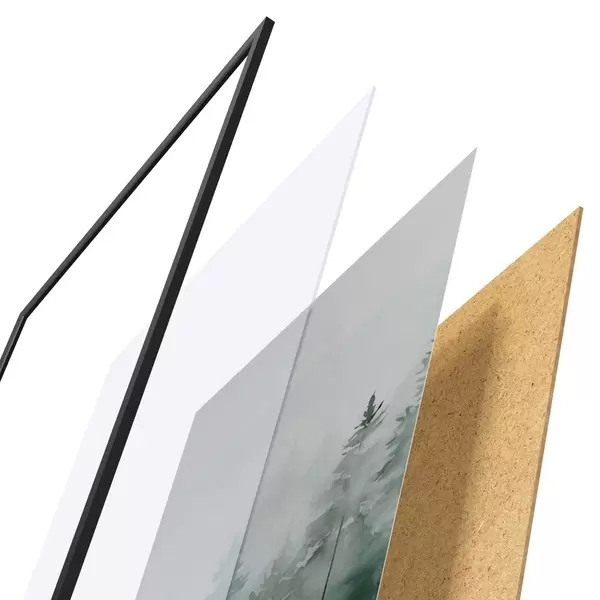A poszter keretből, plexiből, nyomtatott képből és forgácslap hátlapból áll. A poszter a hátoldalon található rögzítőknek köszönhetően azonnal felakasztható a falra.