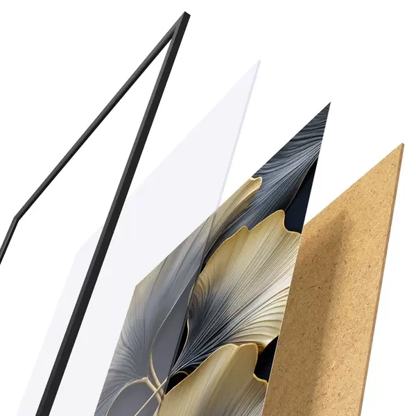 A poszter keretből, plexiből, nyomtatott képből és forgácslap hátlapból áll. A poszter a hátoldalon található rögzítőknek köszönhetően azonnal felakasztható a falra.