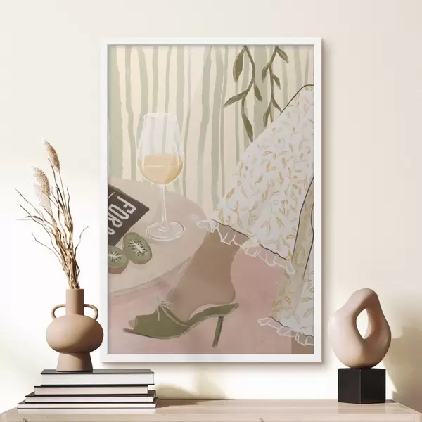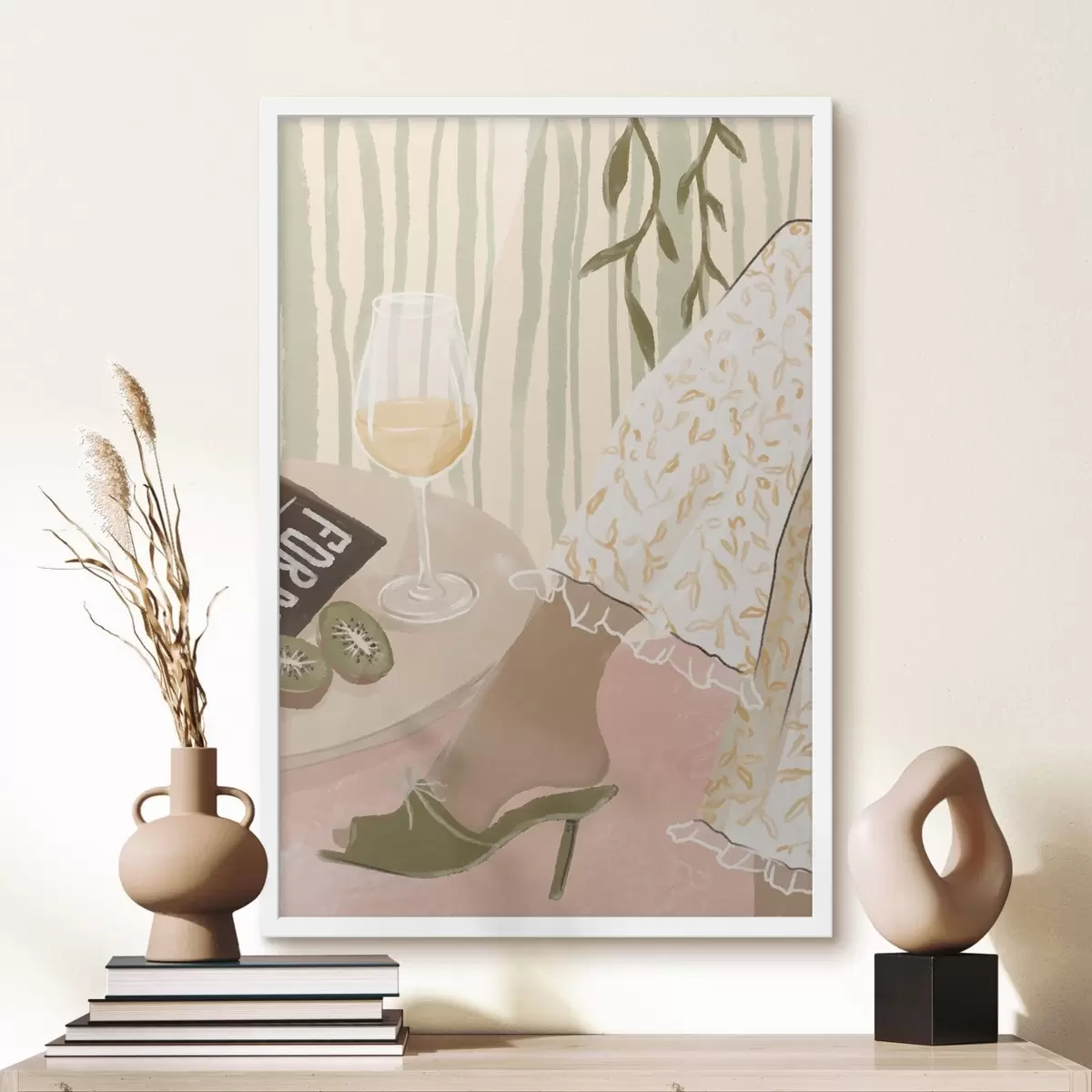 Poster Asztal borospohárral és kivi gyümölccsel, ruha mellett Nr f48021
