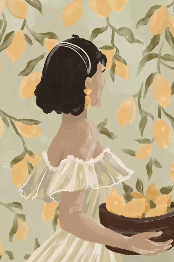 Plakát a sziklán Nő, aki egy tál citromot tart a kezében f48023