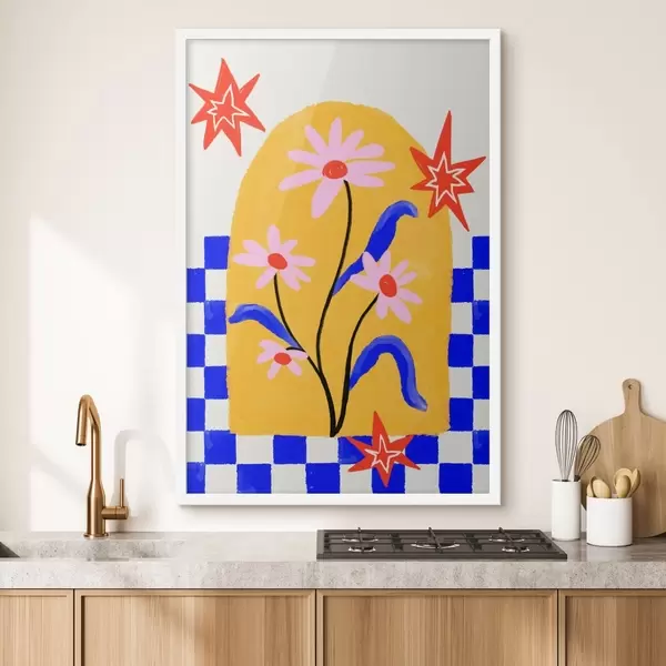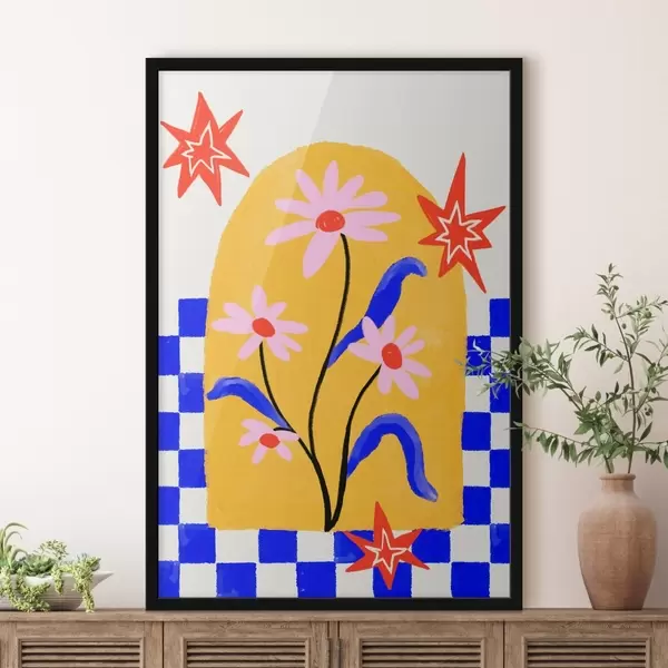 Plakát a sziklán Világos virágok sárga alapon, kék mintával f48034