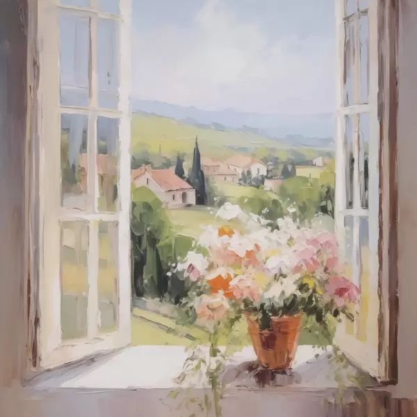Plakát a sziklán Csokor egy vázában az ablak mellett f48052