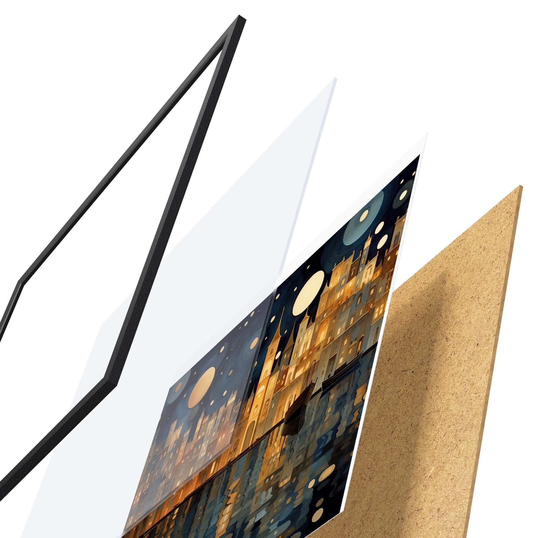 A poszter keretből, plexiből, nyomtatott képből és forgácslap hátlapból áll. A poszter a hátoldalon található rögzítőknek köszönhetően azonnal felakasztható a falra.