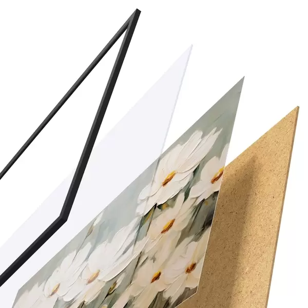 A poszter keretből, plexiből, nyomtatott képből és forgácslap hátlapból áll. A poszter a hátoldalon található rögzítőknek köszönhetően azonnal felakasztható a falra.