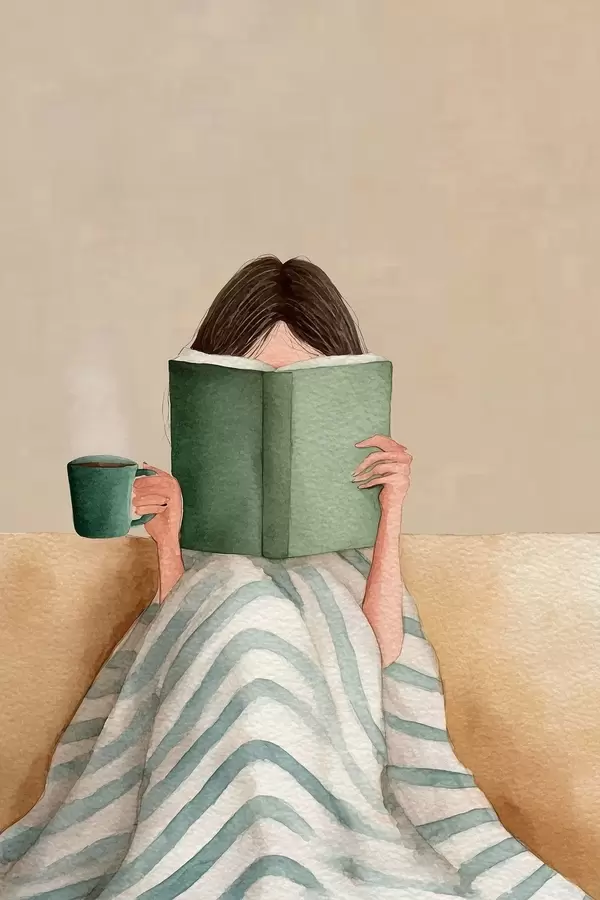 Poster lágy akvarell illusztráció egy kanapén ülő, könyvet olvasó nőről Nr f48114