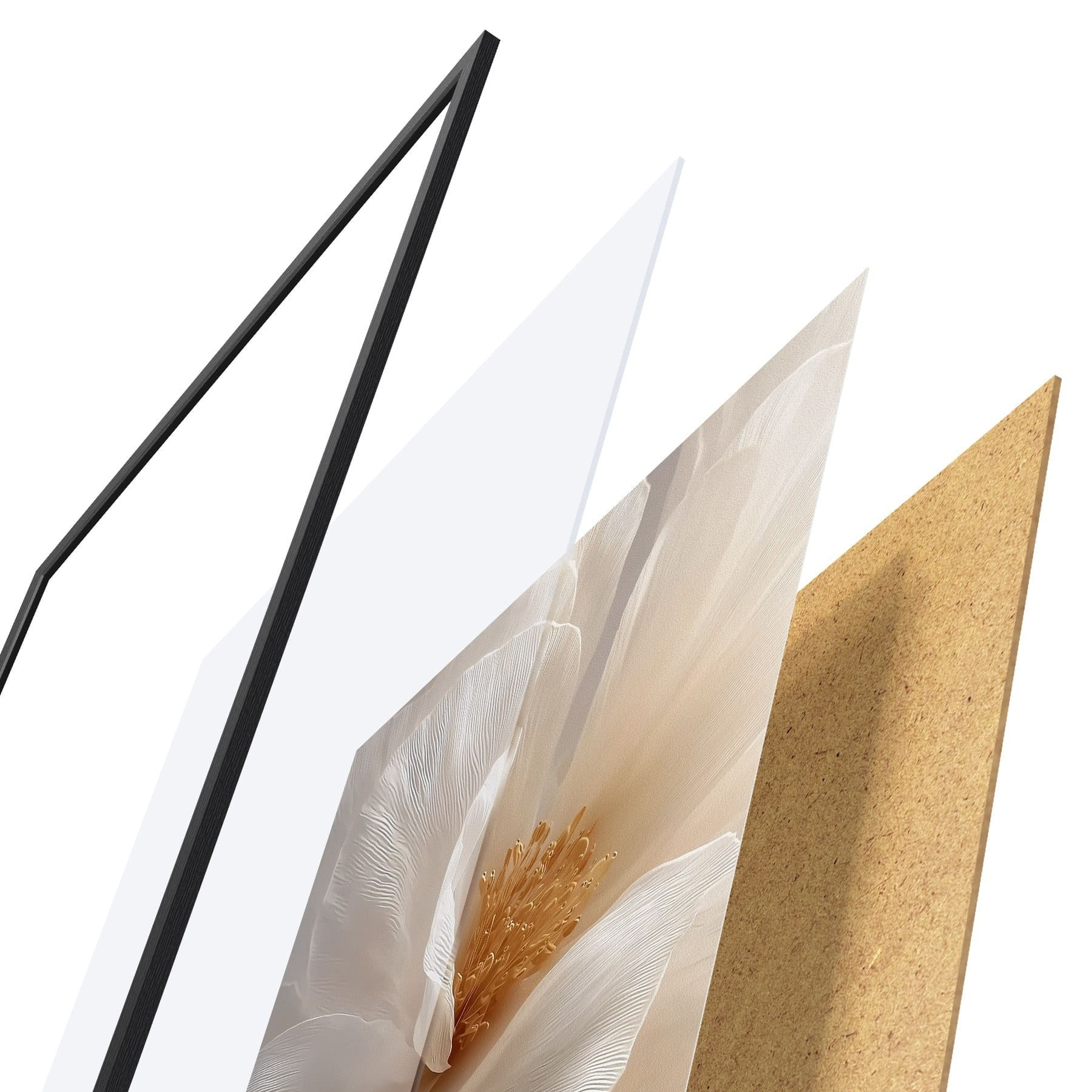 A poszter keretből, plexiből, nyomtatott képből és forgácslap hátlapból áll. A poszter a hátoldalon található rögzítőknek köszönhetően azonnal felakasztható a falra.