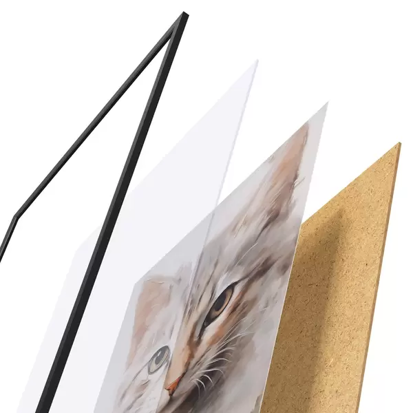A poszter keretből, plexiből, nyomtatott képből és forgácslap hátlapból áll. A poszter a hátoldalon található rögzítőknek köszönhetően azonnal felakasztható a falra.