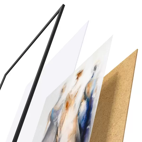 A poszter keretből, plexiből, nyomtatott képből és forgácslap hátlapból áll. A poszter a hátoldalon található rögzítőknek köszönhetően azonnal felakasztható a falra.