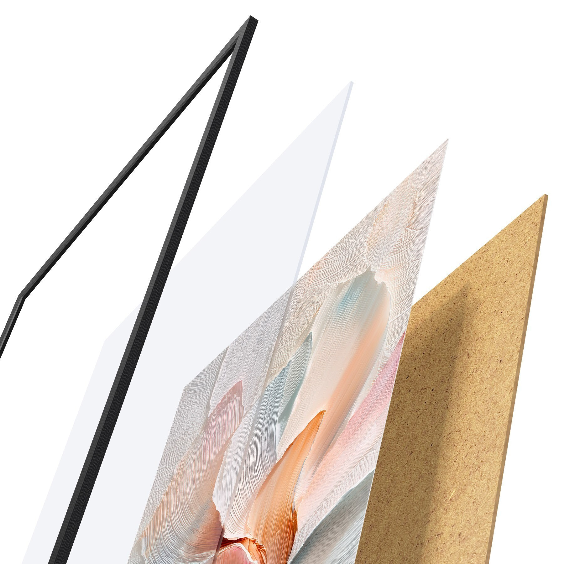 A poszter keretből, plexiből, nyomtatott képből és forgácslap hátlapból áll. A poszter a hátoldalon található rögzítőknek köszönhetően azonnal felakasztható a falra.