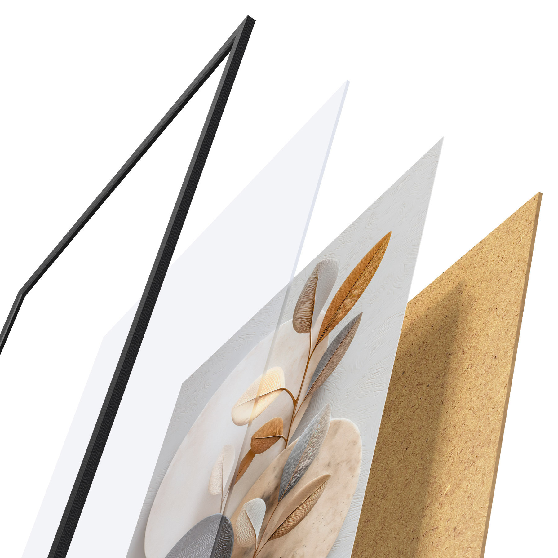 A poszter keretből, plexiből, nyomtatott képből és forgácslap hátlapból áll. A poszter a hátoldalon található rögzítőknek köszönhetően azonnal felakasztható a falra.