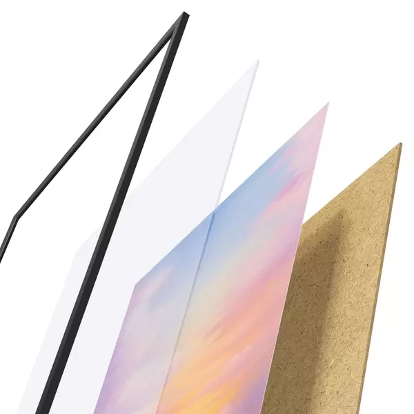 A poszter keretből, plexiből, nyomtatott képből és forgácslap hátlapból áll. A poszter a hátoldalon található rögzítőknek köszönhetően azonnal felakasztható a falra.