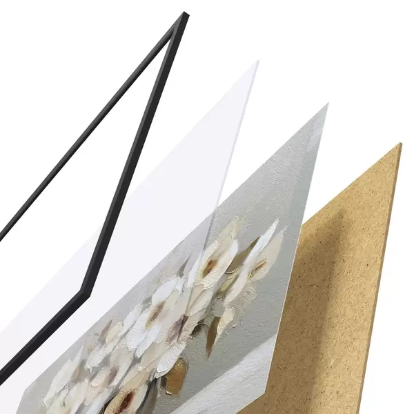A poszter keretből, plexiből, nyomtatott képből és forgácslap hátlapból áll. A poszter a hátoldalon található rögzítőknek köszönhetően azonnal felakasztható a falra.