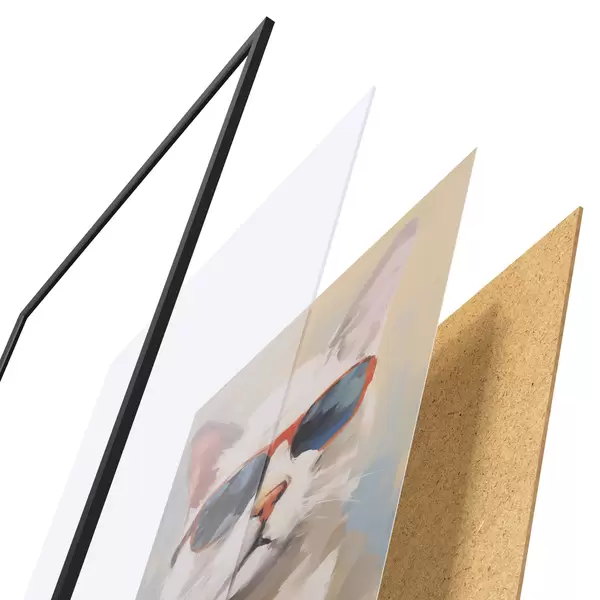 A poszter keretből, plexiből, nyomtatott képből és forgácslap hátlapból áll. A poszter a hátoldalon található rögzítőknek köszönhetően azonnal felakasztható a falra.