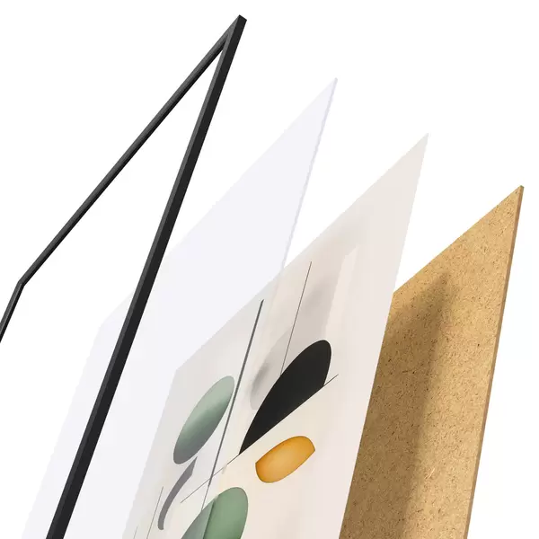 A poszter keretből, plexiből, nyomtatott képből és forgácslap hátlapból áll. A poszter a hátoldalon található rögzítőknek köszönhetően azonnal felakasztható a falra.