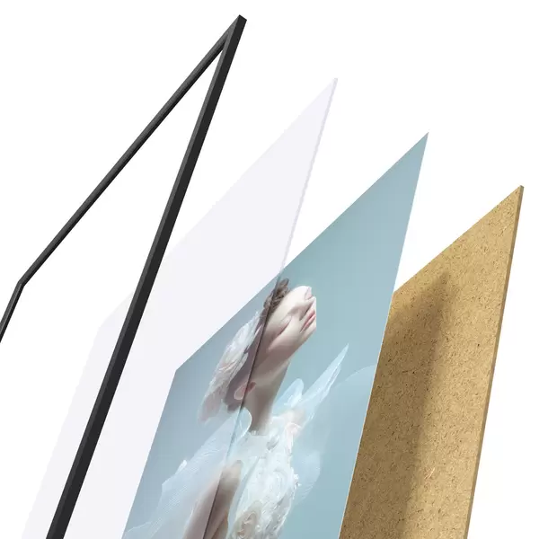 A poszter keretből, plexiből, nyomtatott képből és forgácslap hátlapból áll. A poszter a hátoldalon található rögzítőknek köszönhetően azonnal felakasztható a falra.