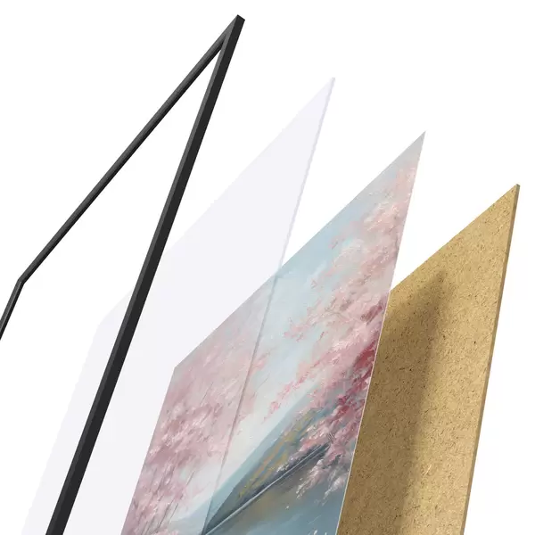 A poszter keretből, plexiből, nyomtatott képből és forgácslap hátlapból áll. A poszter a hátoldalon található rögzítőknek köszönhetően azonnal felakasztható a falra.