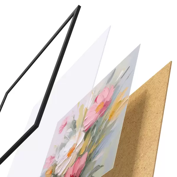 A poszter keretből, plexiből, nyomtatott képből és forgácslap hátlapból áll. A poszter a hátoldalon található rögzítőknek köszönhetően azonnal felakasztható a falra.