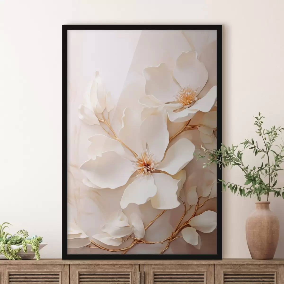 Plakát a sziklán Könnyed virágok vékony ágakkal pasztell háttér előtt f48348