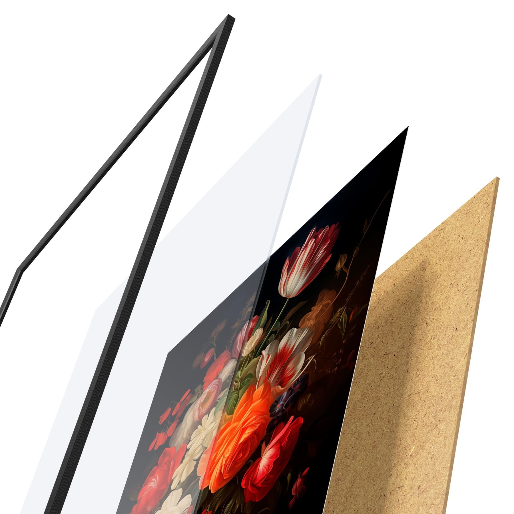 A poszter keretből, plexiből, nyomtatott képből és forgácslap hátlapból áll. A poszter a hátoldalon található rögzítőknek köszönhetően azonnal felakasztható a falra.