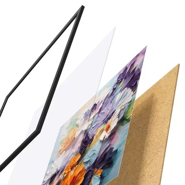 A poszter keretből, plexiből, nyomtatott képből és forgácslap hátlapból áll. A poszter a hátoldalon található rögzítőknek köszönhetően azonnal felakasztható a falra.