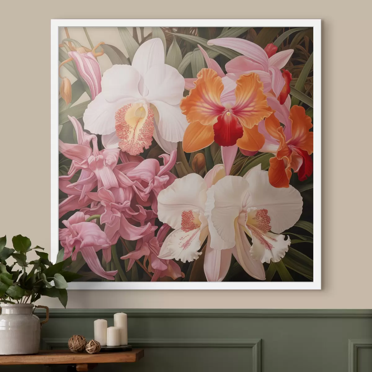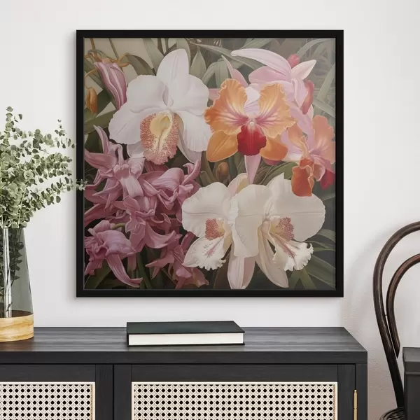 Poster Trópusi virágcsokor, orchideák zöld lombozattal a háttérben Nr f48385