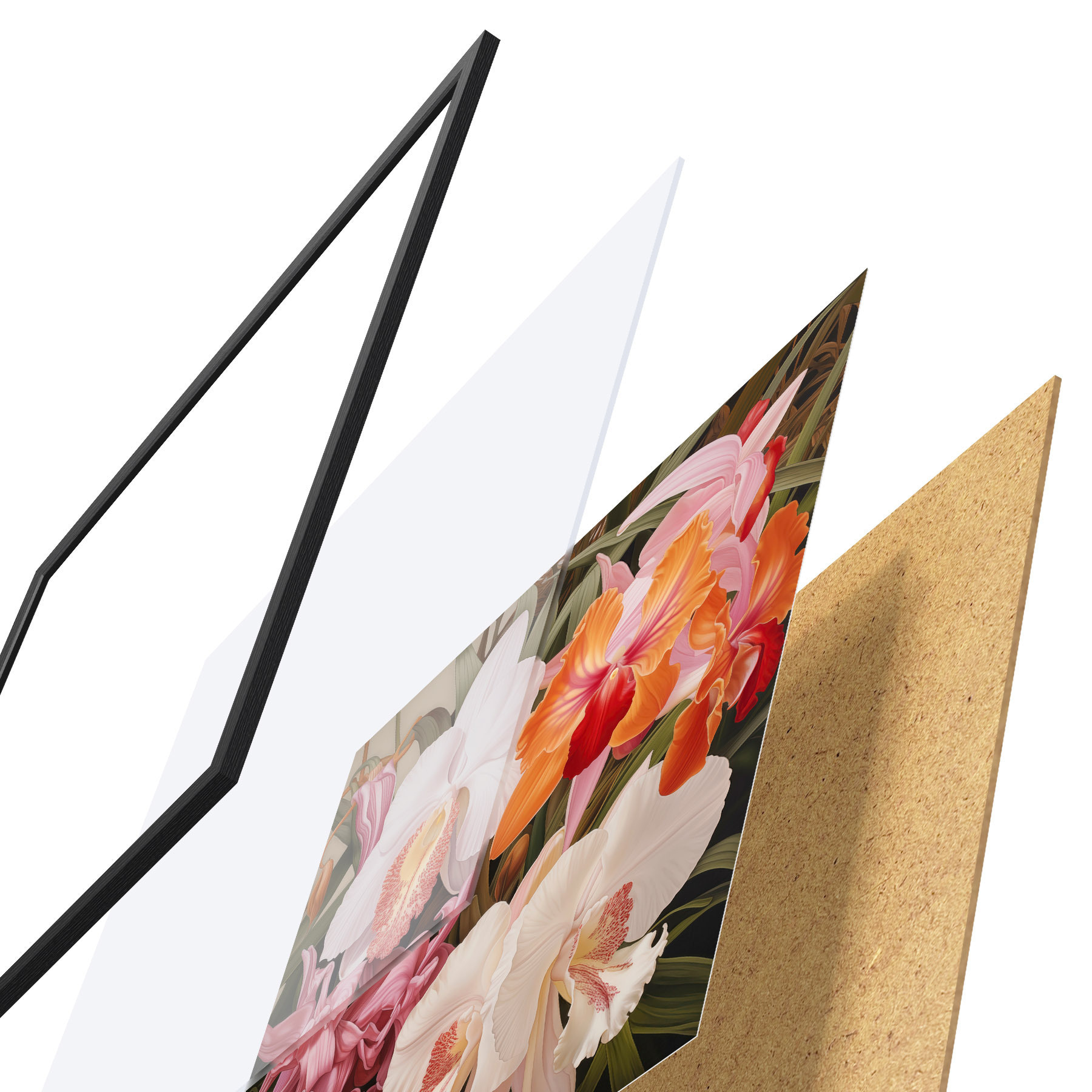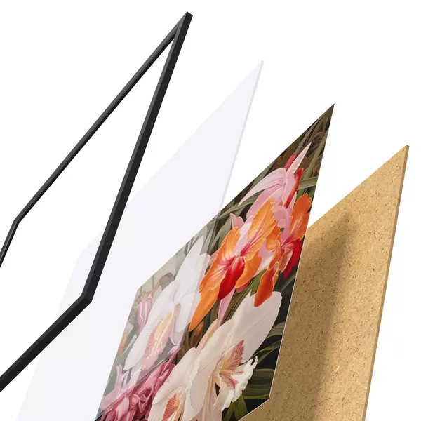 A poszter keretből, plexiből, nyomtatott képből és forgácslap hátlapból áll. A poszter a hátoldalon található rögzítőknek köszönhetően azonnal felakasztható a falra.