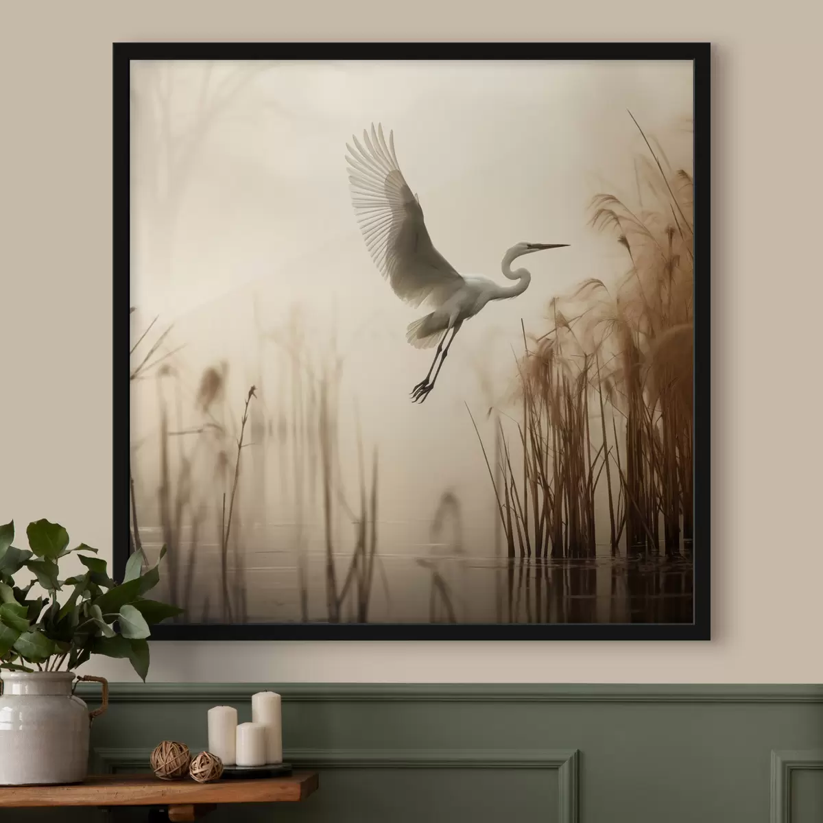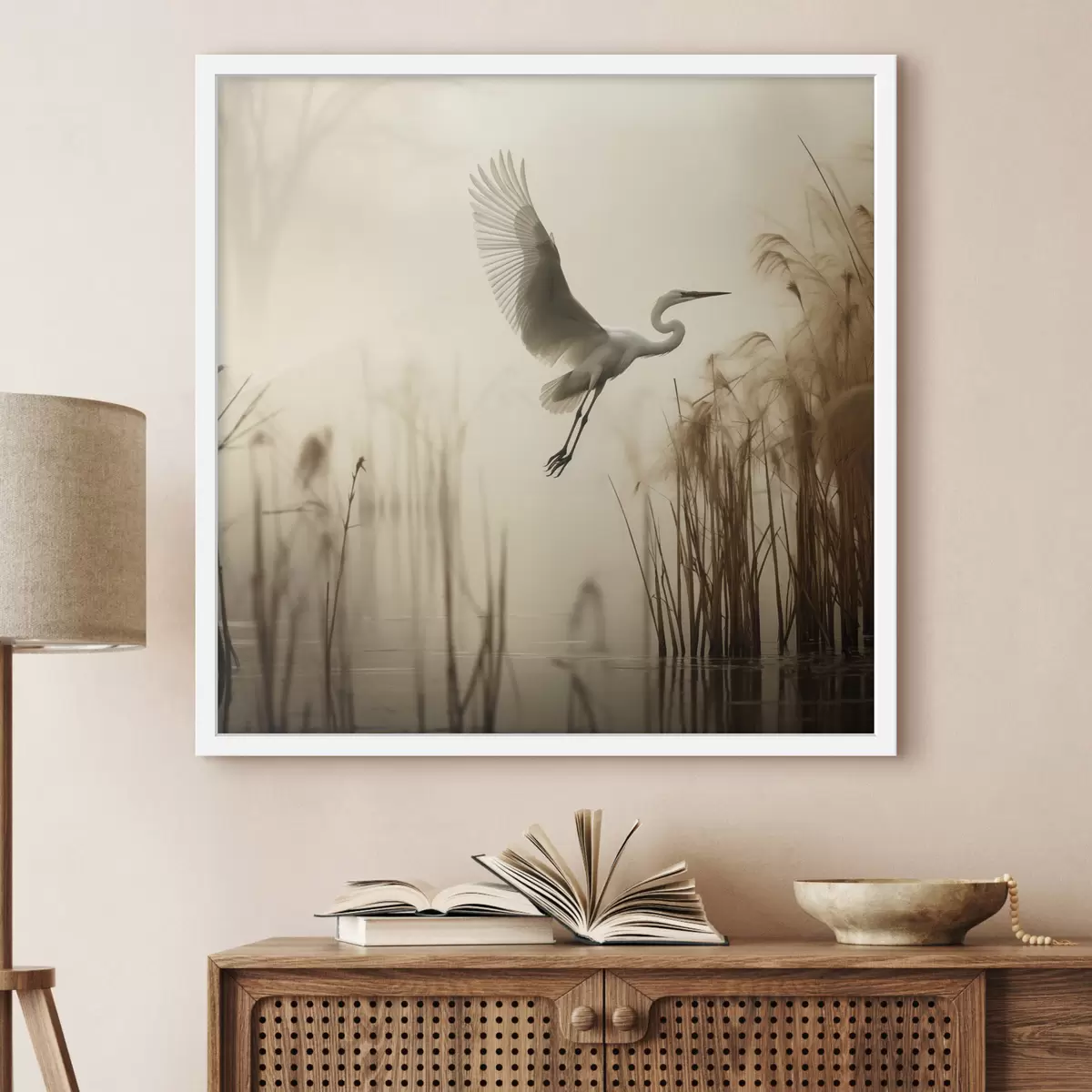 Poster Egy fehér gém repül át egy tó felett, amelyet magas nádas és a háttérben álló fák vesznek körül Nr f48389