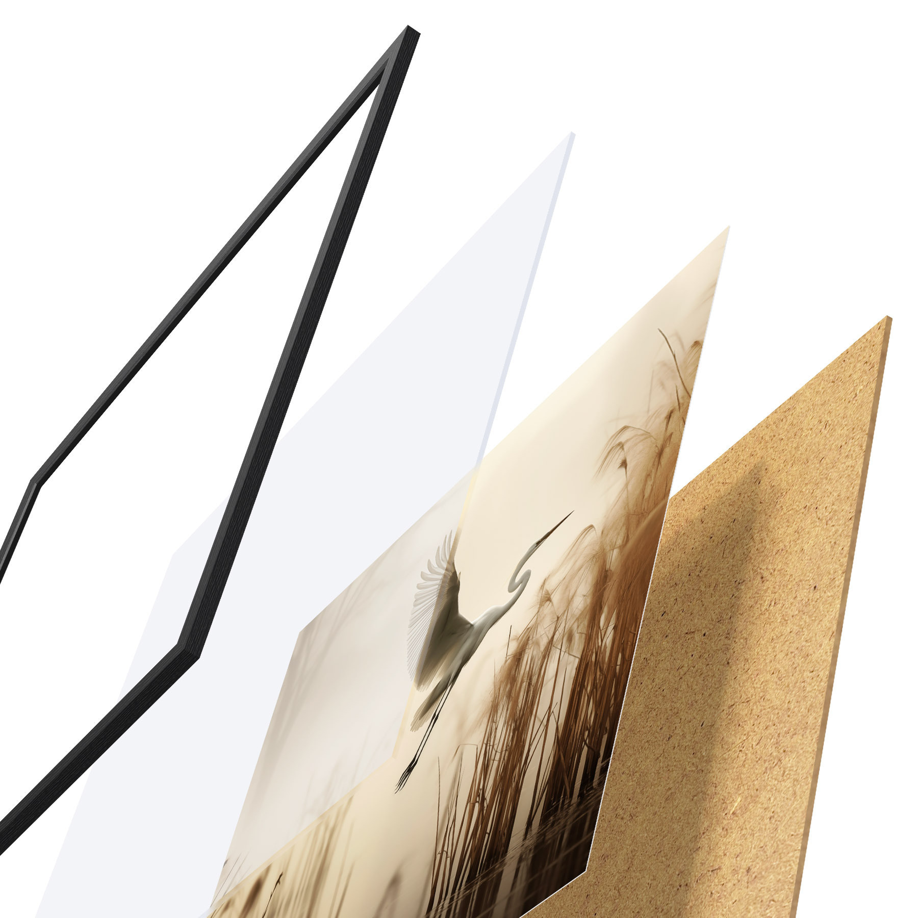 A poszter keretből, plexiből, nyomtatott képből és forgácslap hátlapból áll. A poszter a hátoldalon található rögzítőknek köszönhetően azonnal felakasztható a falra.