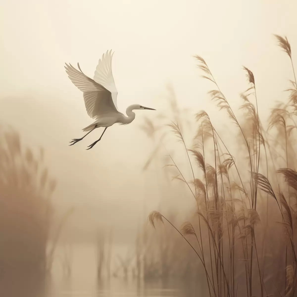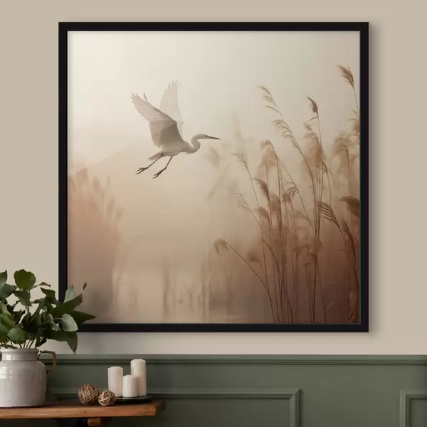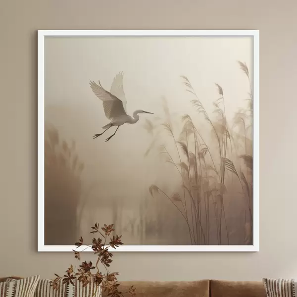 Poster Egy fehér gém repül át egy tó felett, amelyet magas nádas és a háttérben álló fák vesznek körül Nr f48390