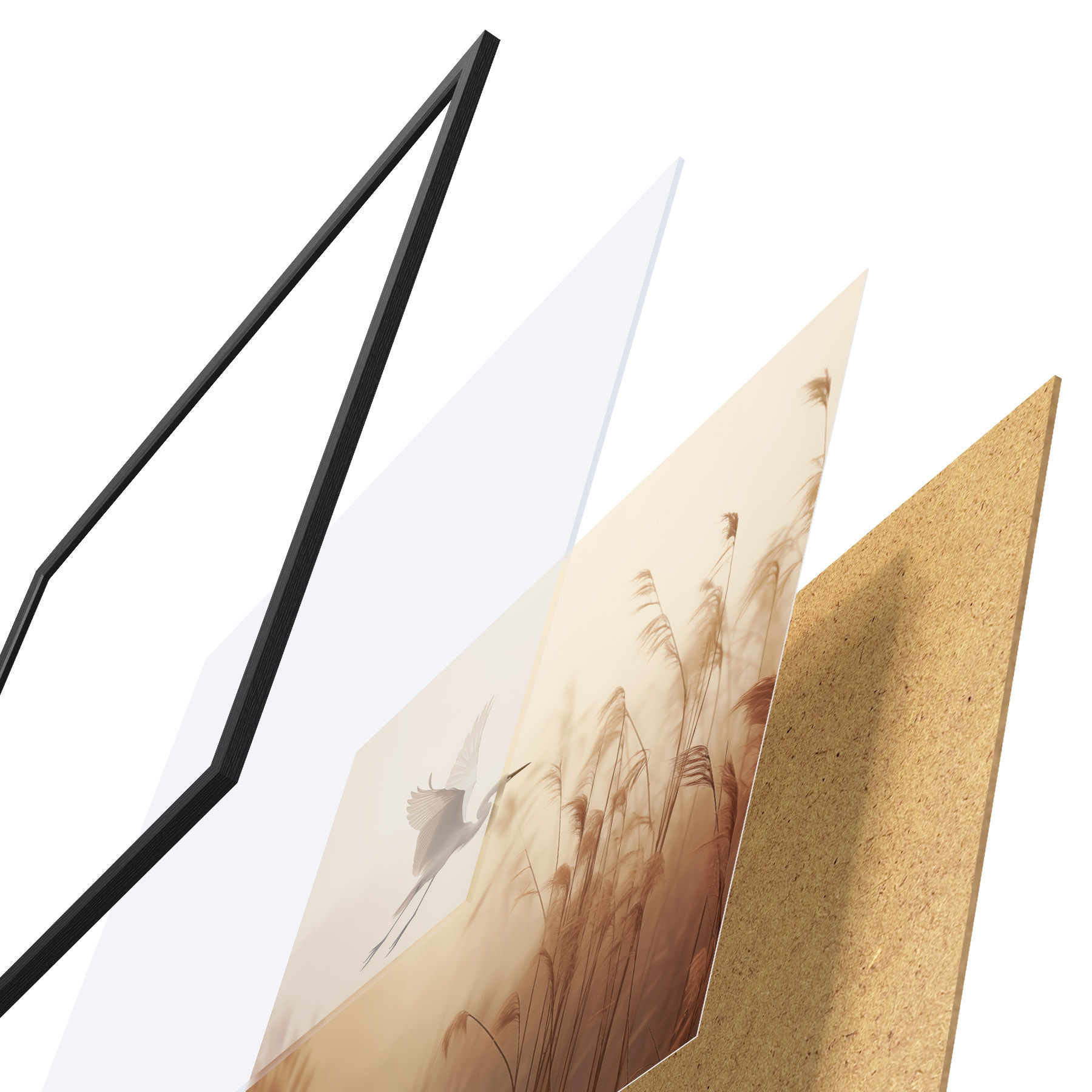 A poszter keretből, plexiből, nyomtatott képből és forgácslap hátlapból áll. A poszter a hátoldalon található rögzítőknek köszönhetően azonnal felakasztható a falra.
