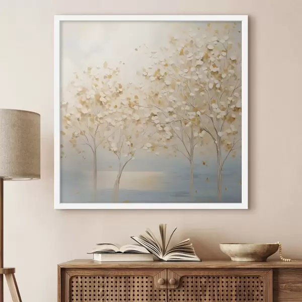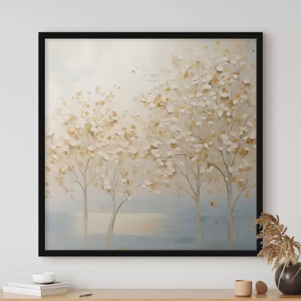 Plakát a sziklán Texturált festmény, amelyen fehér és sárga levelű fák láthatók világoskék háttér előtt f48392