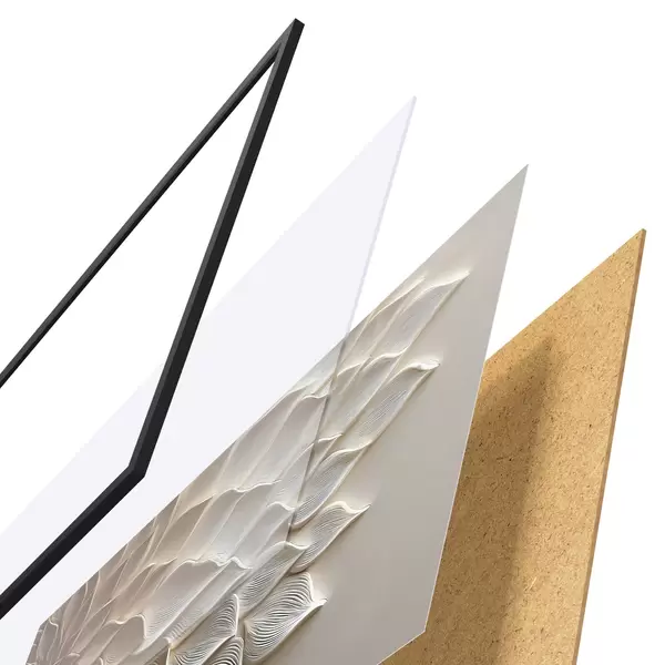 A poszter keretből, plexiből, nyomtatott képből és forgácslap hátlapból áll. A poszter a hátoldalon található rögzítőknek köszönhetően azonnal felakasztható a falra.