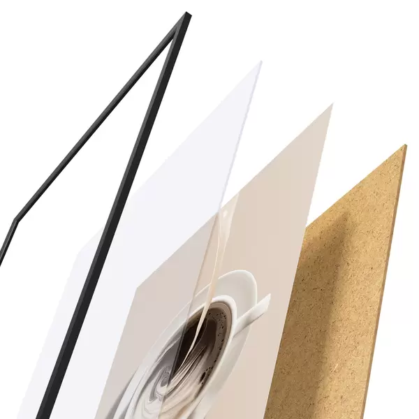 A poszter keretből, plexiből, nyomtatott képből és forgácslap hátlapból áll. A poszter a hátoldalon található rögzítőknek köszönhetően azonnal felakasztható a falra.